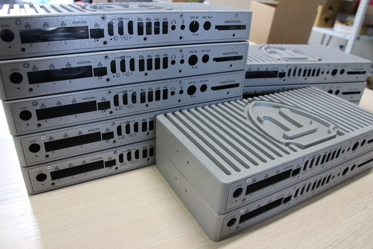 На лицевые панели корпуса нанесли изображение (информацию о типах разъемов, входов-выходов) методом УФ-печати в разрешении 1200 dpi.