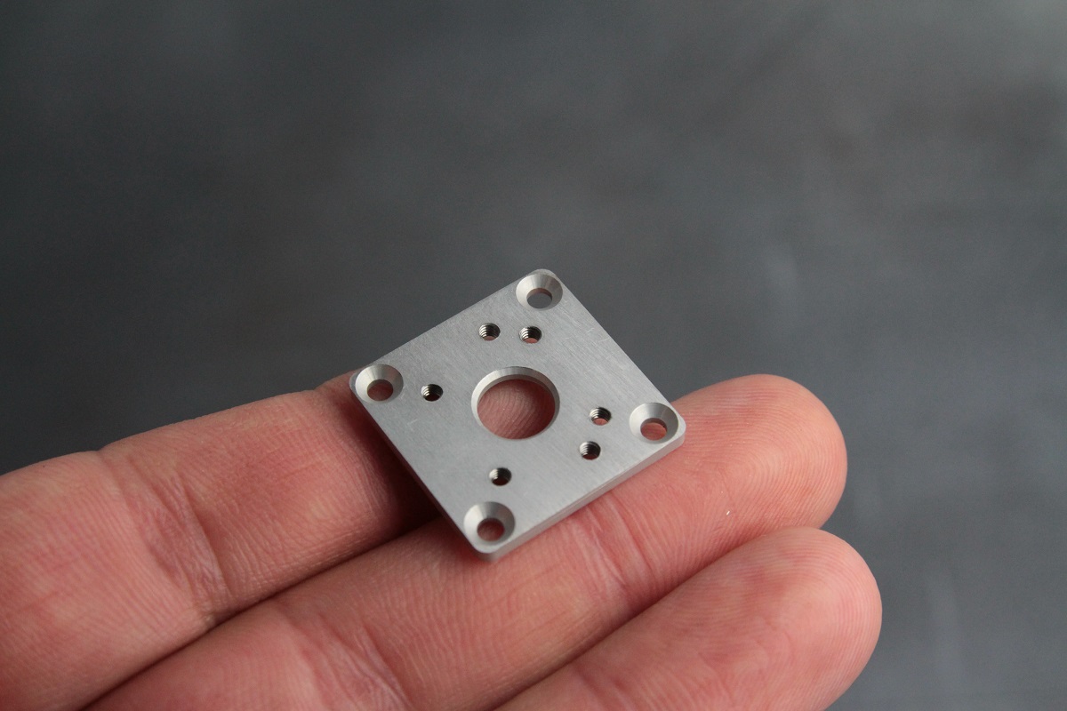 Из 42 мм алюминия высокоточной ЧПУ-фрезеровкой сделали “большой” корпус. Выполнены снятие фаски с обеих сторон, зенковка и выборка сферической фрезой R2, R5, отверстия под нарезку резьбы.