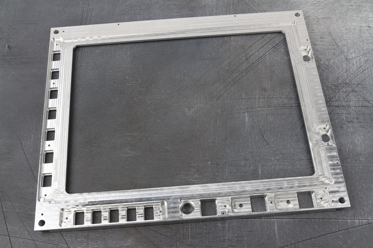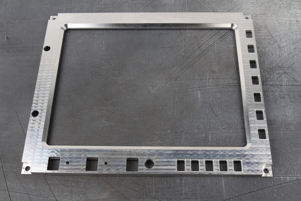Из 8.0 мм алюминия марки АМГ2М на фрезерном ЧПУ-станке изготовили лицевую панель индикатора. По периметру и с внутренней стороны панели сняли фаску.