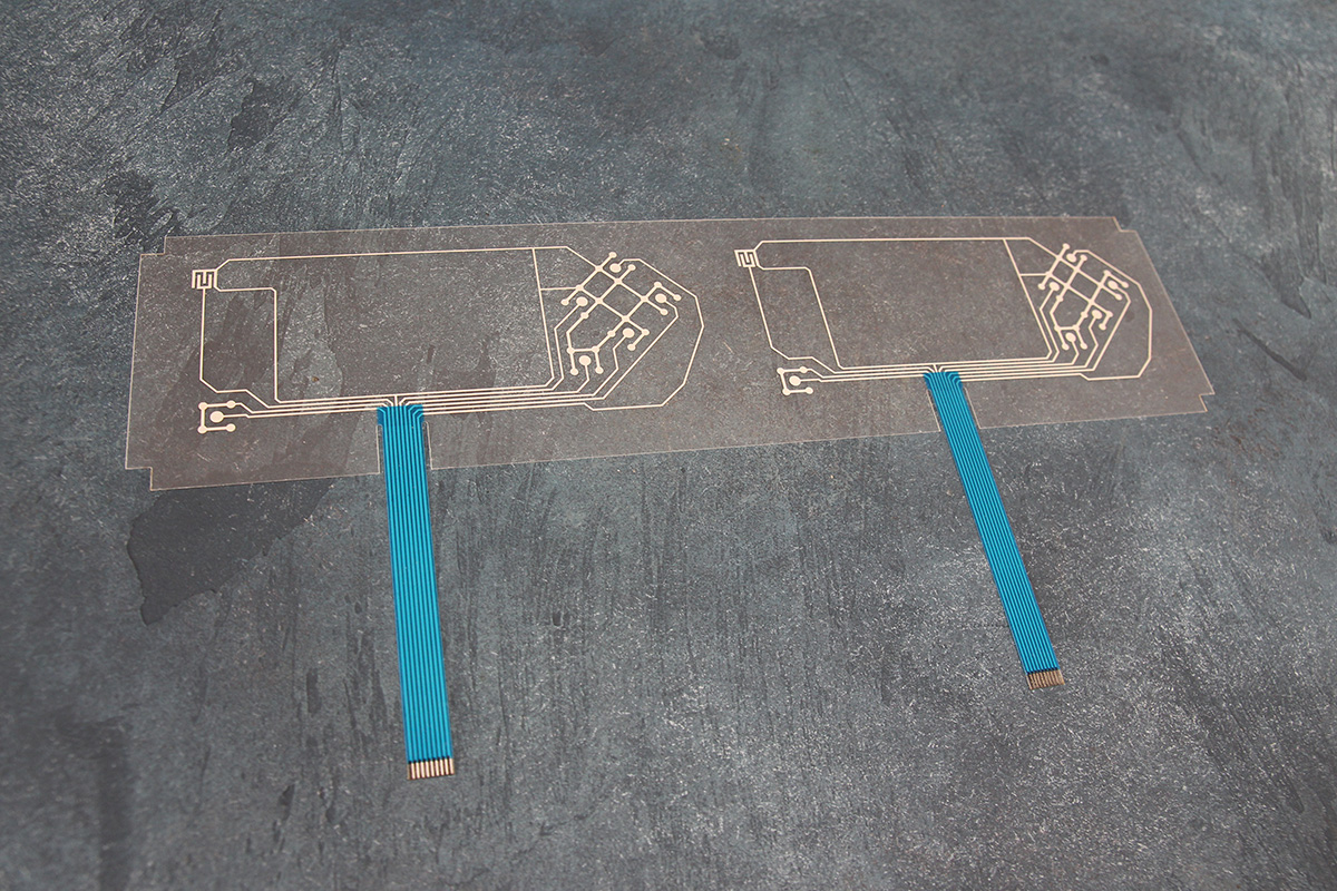 Изготовили печатную электронику методом трафаретной печати серебряной пастой электрических дорожек. Контактирующие с воздухом участки закрыли диэлектриком. Контактное окончание шлейфа покрыли графитом, что обеспечивает безопасность печатных дорожек при взаимодействии с контактами разъема. Проверили дорожки на каждом отпечатке на отсутствие короткого замыкания, разрывов и сопротивление.