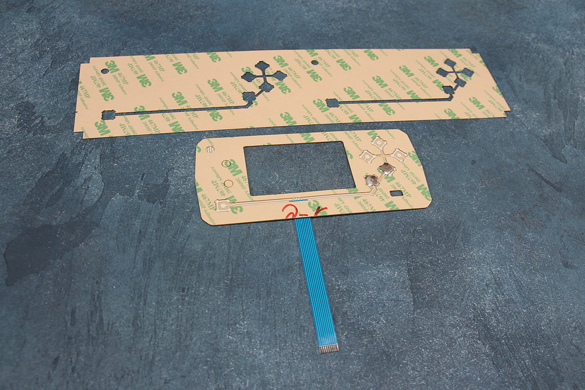 На лазерном станке вырезали безосновный клей марки 3М 7952MP. Установили 10мм мембраны (с усилием нажатия 220гр) на места контактов в печатной ПЭТ-плате.