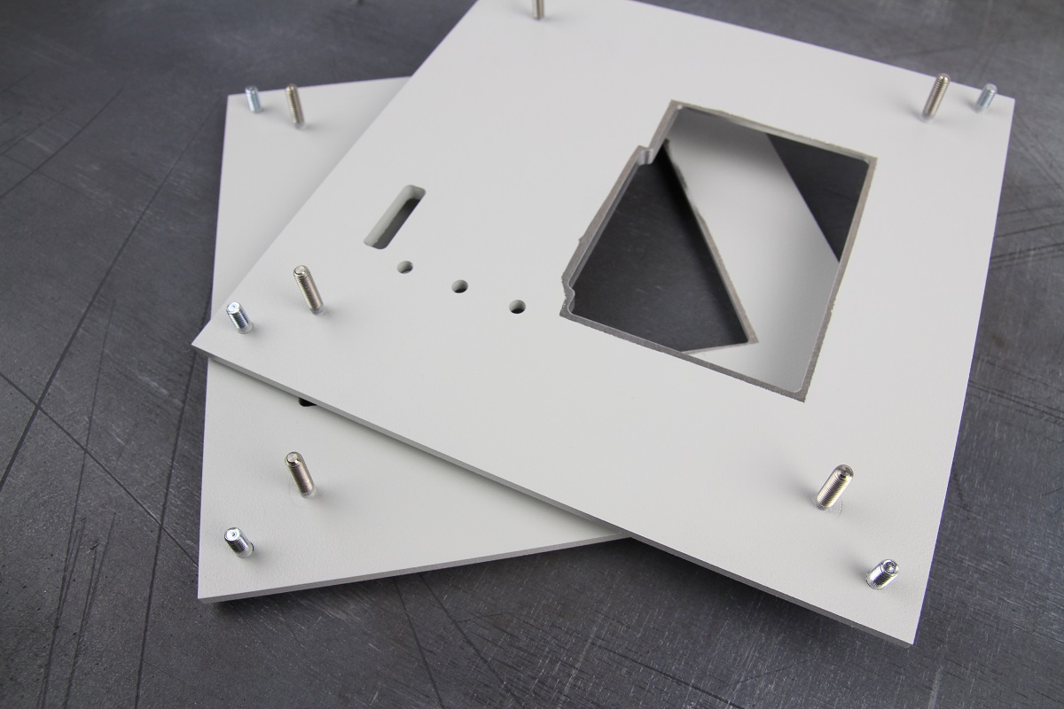 Защитили посадочное место для клавиатуры, метизы и окно с внутренней стороны панели. В порошковой камере нанесли краску белого цвета RAL 7035 с текстурой муар.