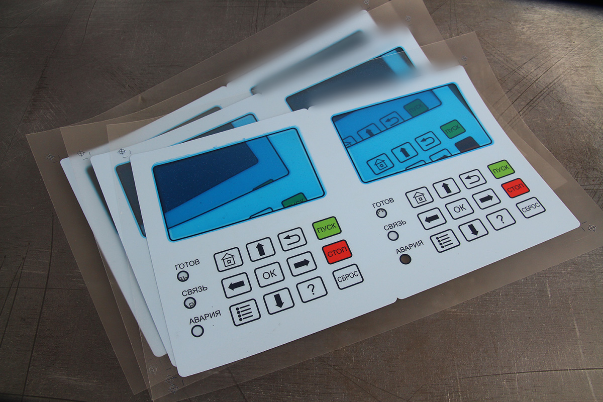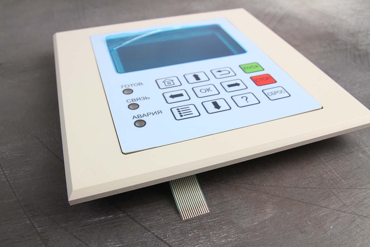 На матовом лавсане F150 методом шелкографии в 4 цвета изготовили пленочную лицевую панель. Выполнили термо-вакуумную формовку кнопок.