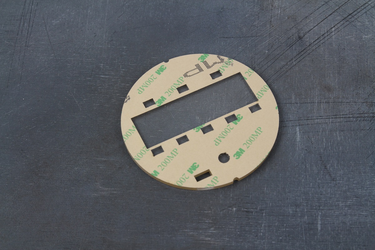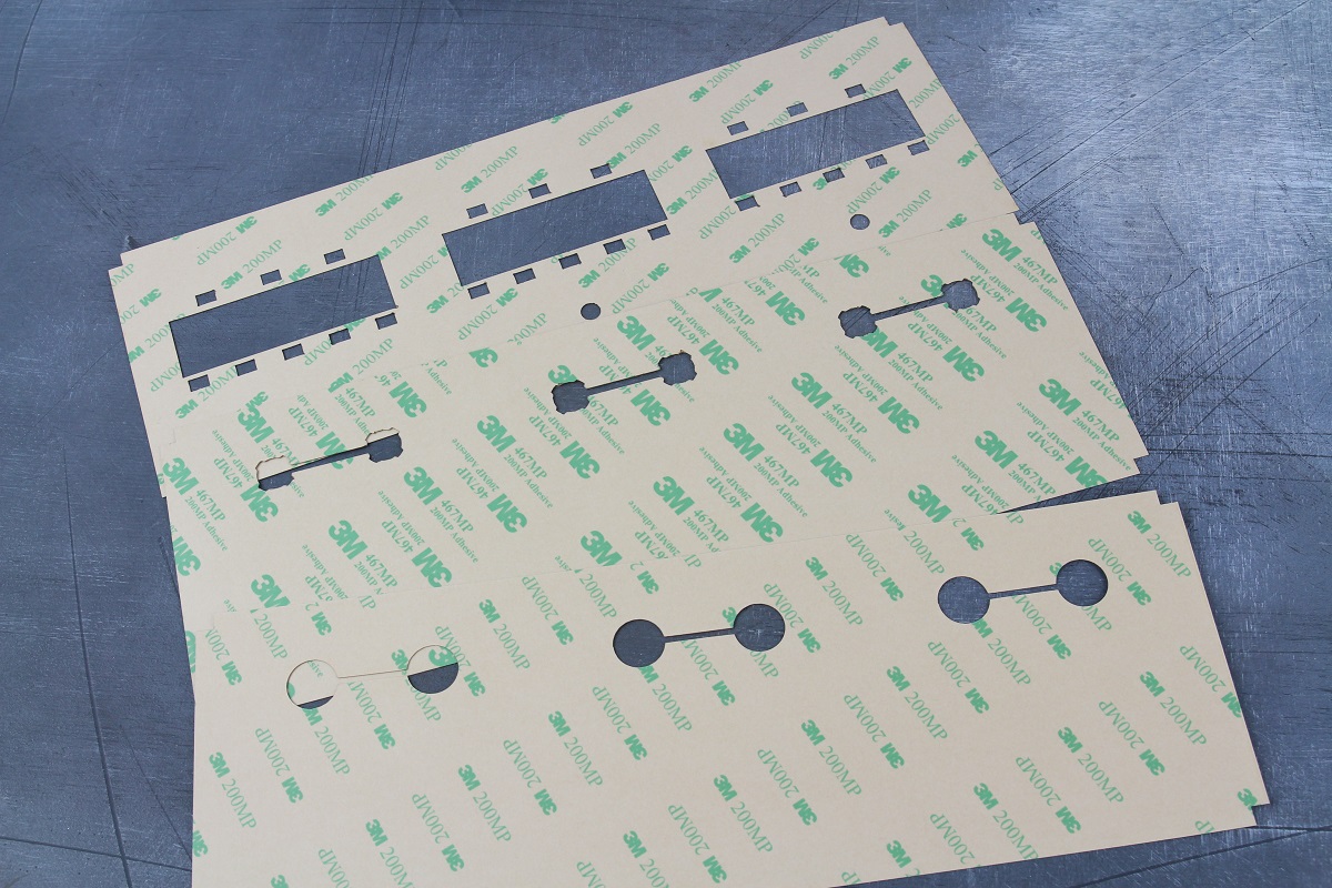 На лазерном ЧПУ-станке нарезали 3 вида клеевых слоев марки 3М 8132 LE, за счет которых будут соединяться слои пленочной клавиатуры в общий “бутерброд”.