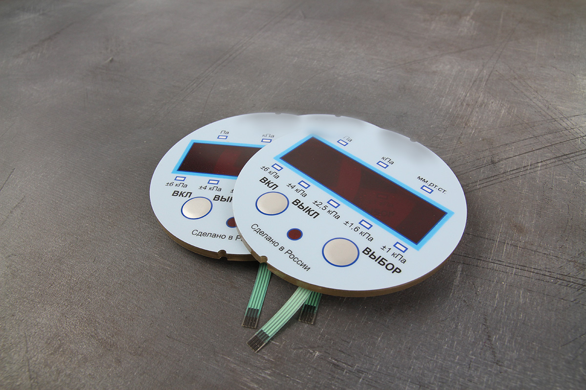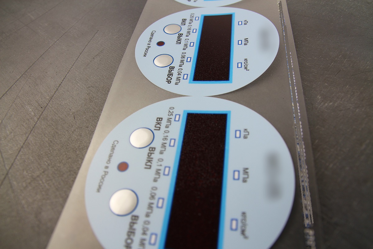 Методом шелкографии на матовом лавсане F150 в 4 цвета изготовили пленочную лицевую панель с двумя прозрачными светофильтрами - красным и белым.