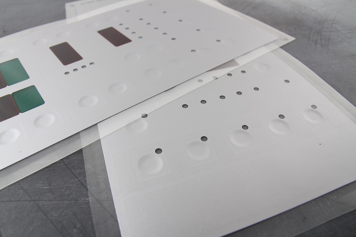 За счет вакуума и нагрева сделали на пленке выпуклую форму кнопок (так называемая “формовка”, “пуклевка”).