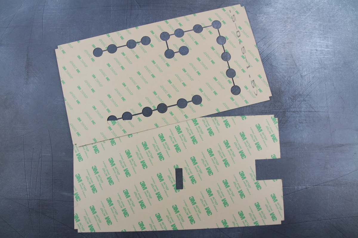 На лазерном ЧПУ-станке нарезали 2 вида клеевых слоев марки 3М, за счет которых будут соединяться слои пленочной клавиатуры в общий “бутерброд”.