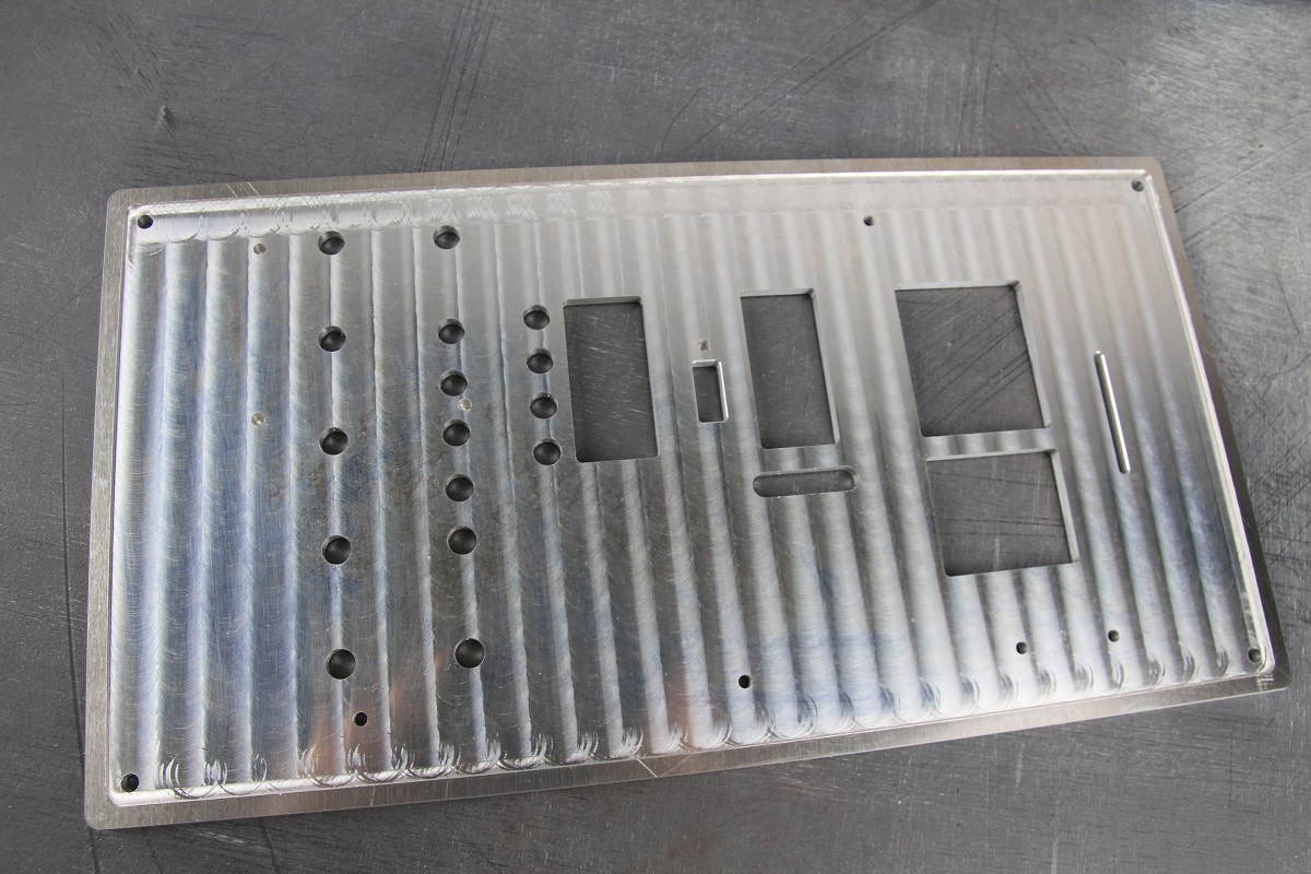 Из 5.0 мм алюминия марки АМГ2М отфрезеровали панели, которые будут служить жестким основанием для пленочной клавиатуры. В панелях по периметру снята радиальная фаска 1 мм.