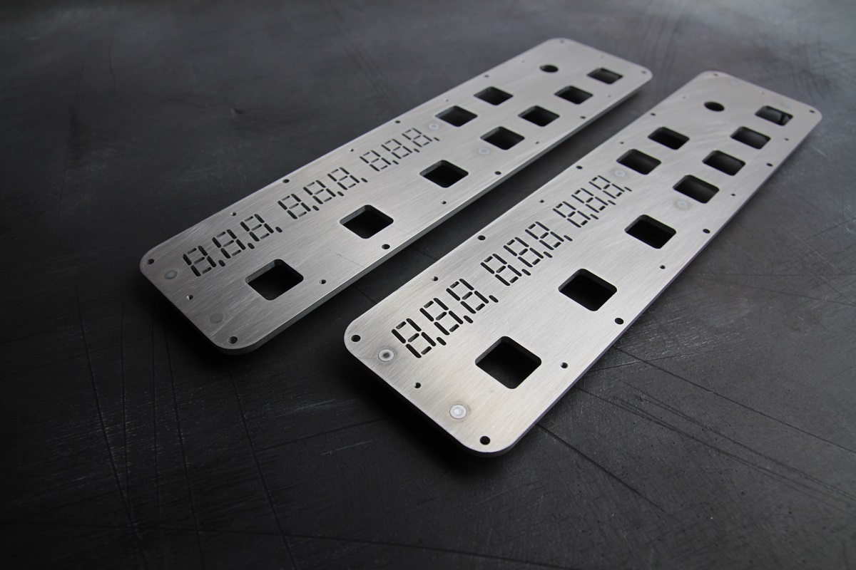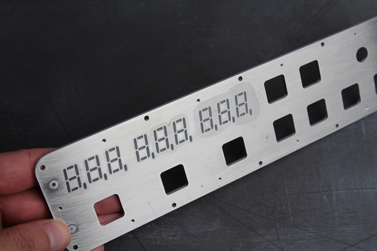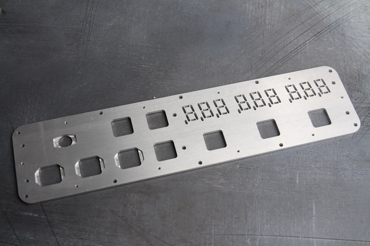 На ЧПУ-станке отфрезеровали 3.0 мм панель из алюминия. Посадочные места для 4 кнопок сделаны с выборкой 2 мм.