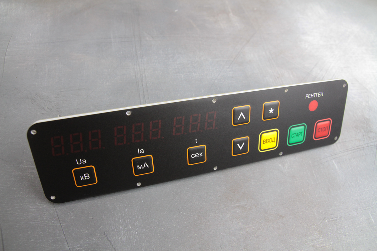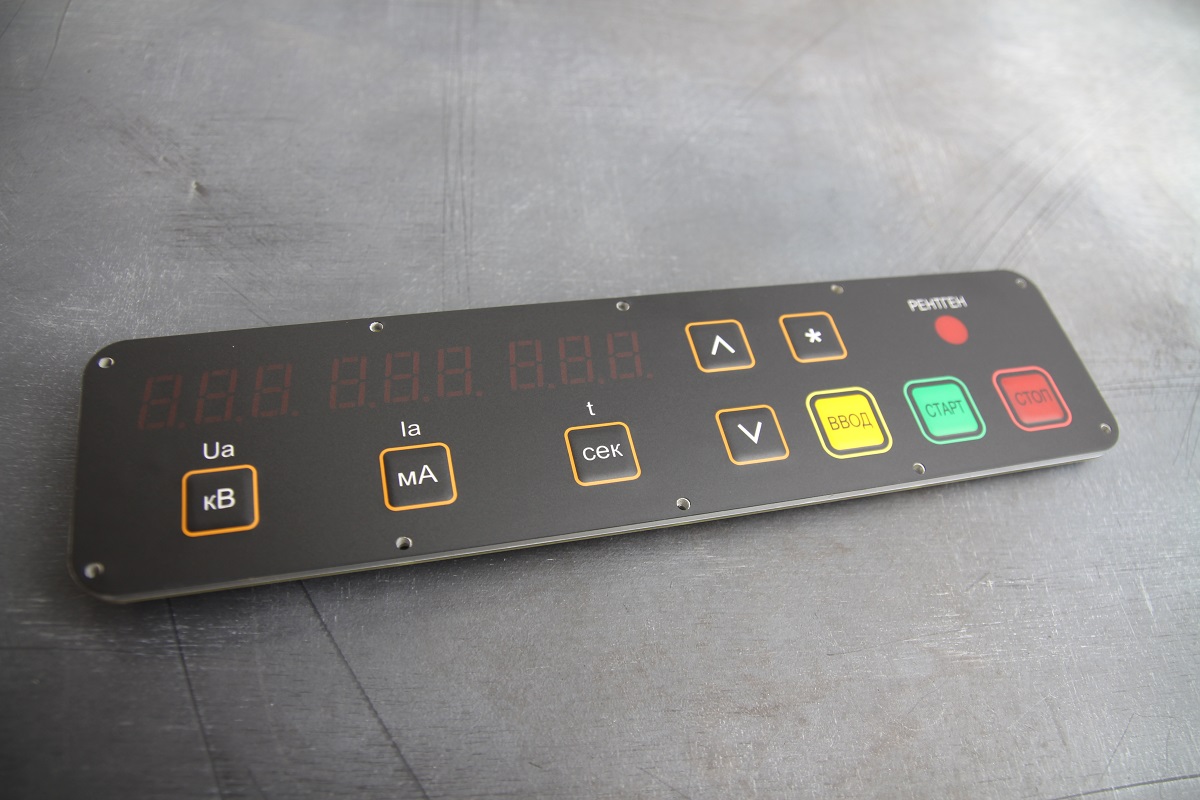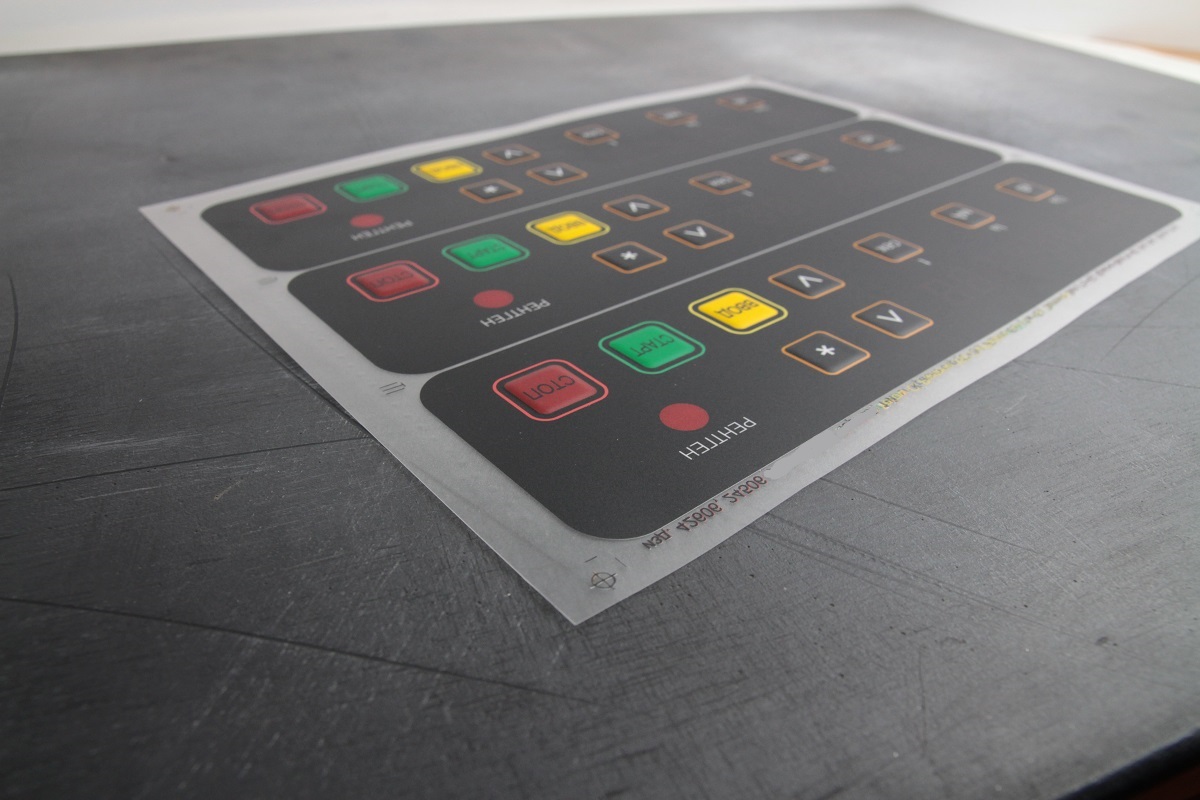 На участке шелкографии из матового лавсана F150 в 6 цветов сделали лицевую пленочную панель. Выполнили термо-вакуумную формовку кнопок.