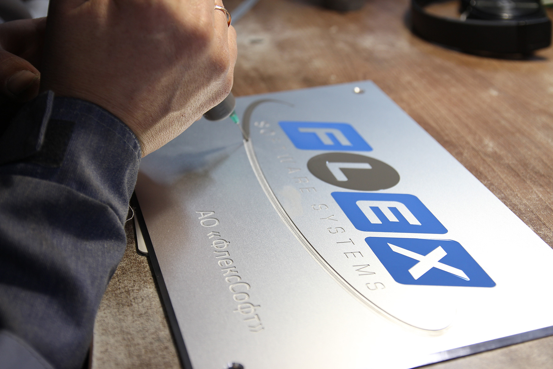 Эмалерист сделал заливку надписей эмалью в двух цветах в соответствии с фирменными цветами заказчика.