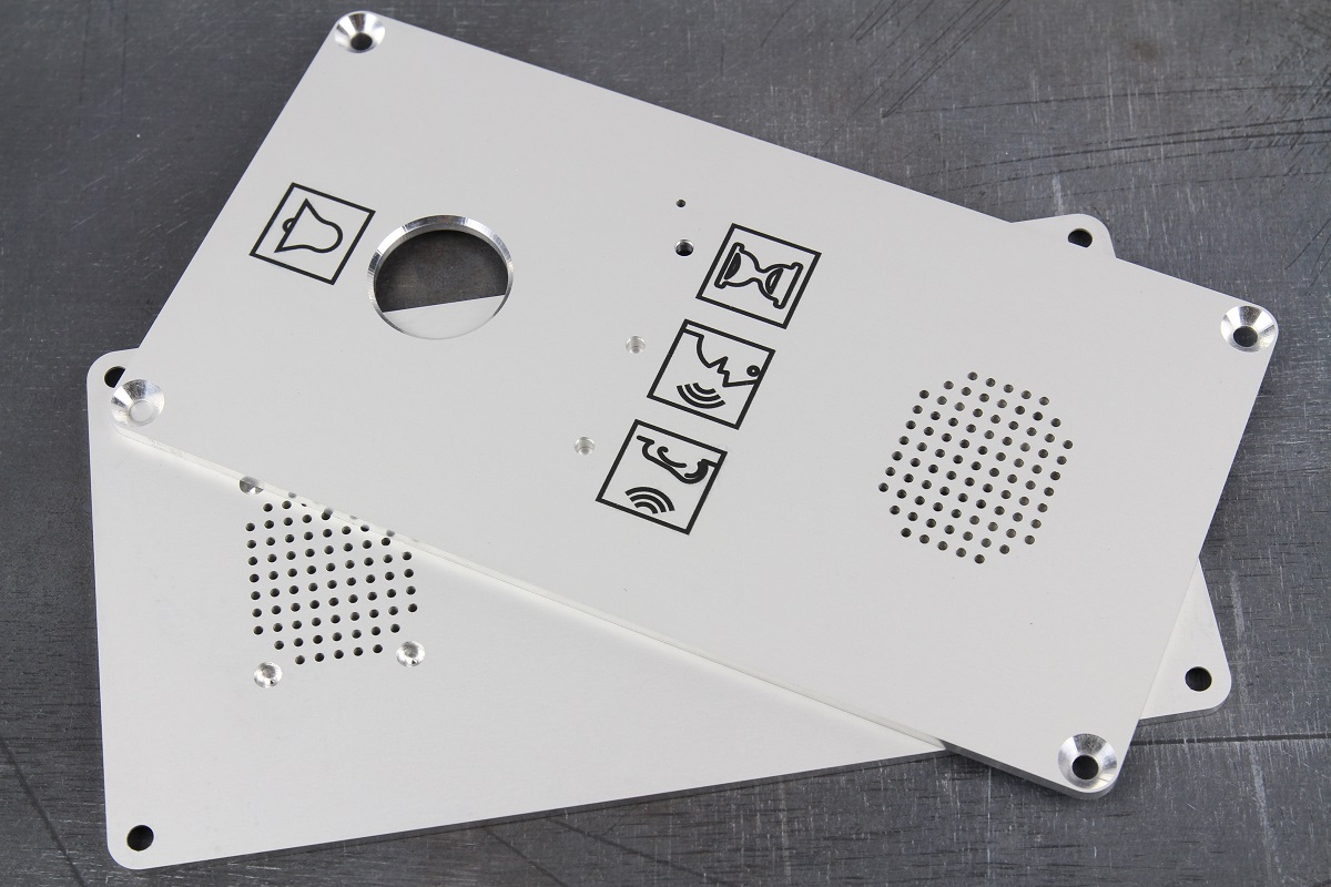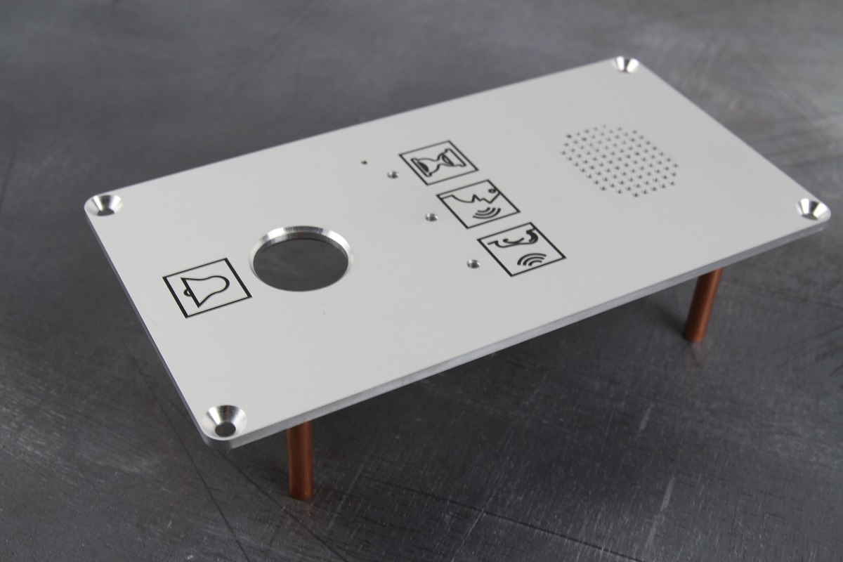 Из 3.0 мм анодированного алюминия на фрезерном ЧПУ-станке отфрезеровали лицевую панель вызывного устройства. Сделали зенковку отверстий и сняли фаску у отверстия для вызывной кнопки.