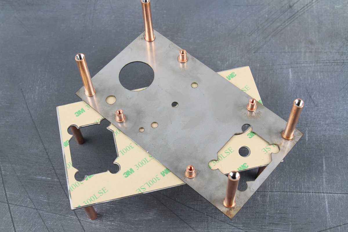 Лазерной резкой изготовили основание монтажной панели из 1.0 мм нержавеющей стали. При помощи конденсаторной сварки и прицелочного трафарета установили омедненные резьбовые втулки - М3х8 и М3х40. На монтажную панель нанесли клеевой слой 3М 93010LE, заранее нарезанный на ЧПУ-лазерном станке.