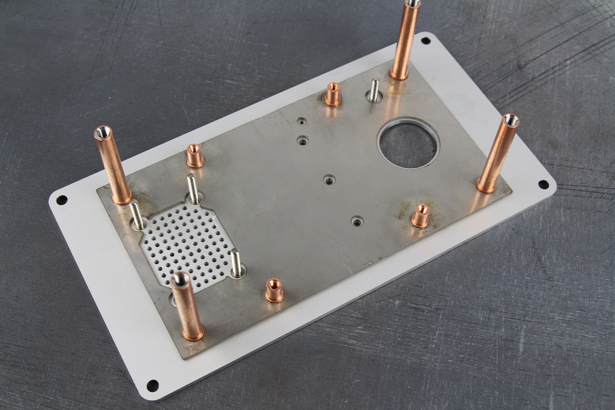 3.0 мм анодированный алюминий, шпильки запрессовочные CHA-M3-16 и CHA-M3-12, втулки приварные омедненные, 1.0 мм нержавеющая сталь, клей 3М 93010LE.